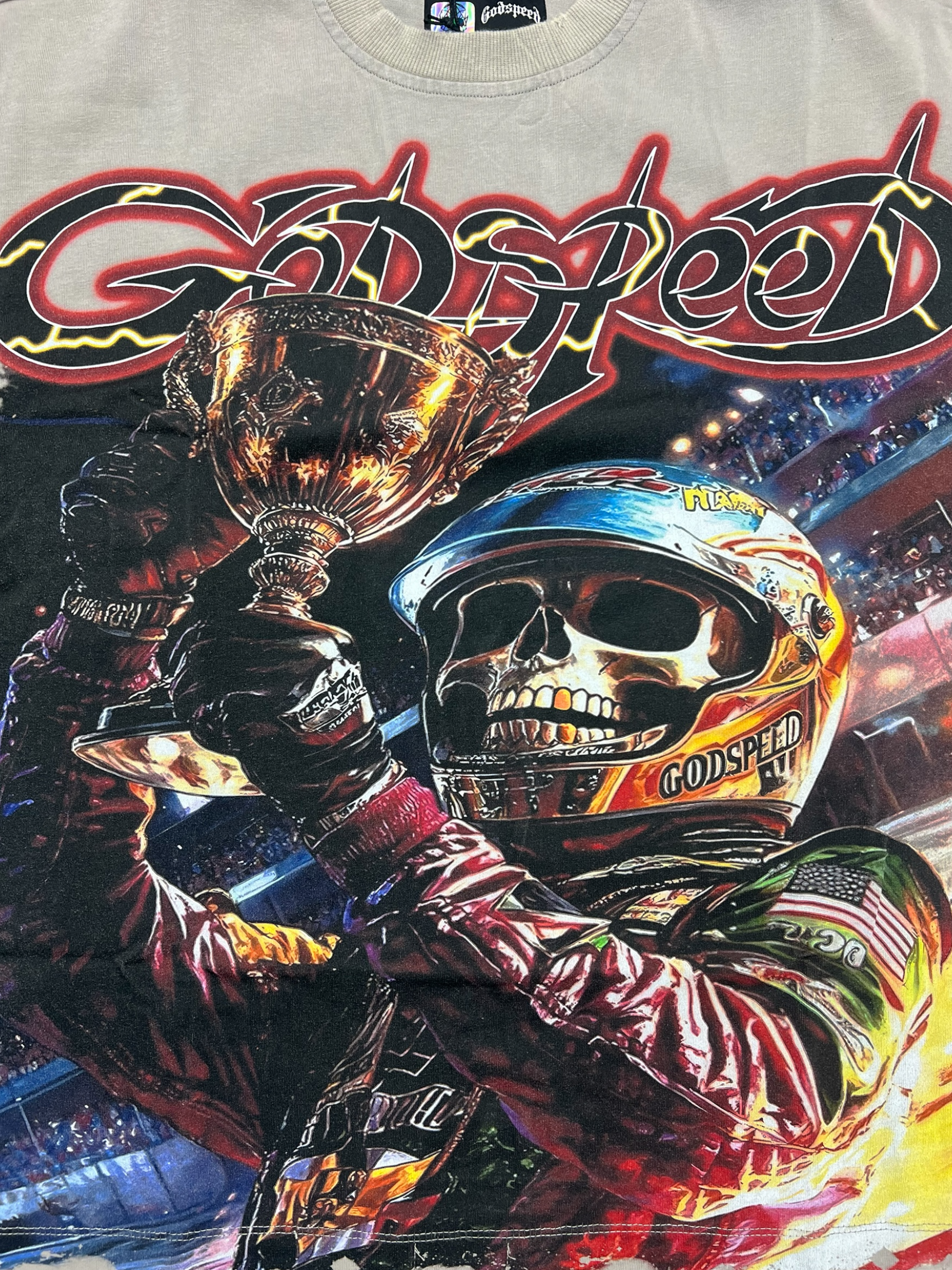 The Godspeed Podium Dreams T-Shirt is crafted from 10oz mid-weight washed fabric and features a striking digital art piece.